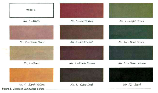 Τα χρησιμοποιούμενα χρώματα είναι 9 και προέρχονται από τα 12 ήδη διαθέσιμα χρώματα παραλλαγής του Αμερικανικού Στρατού.