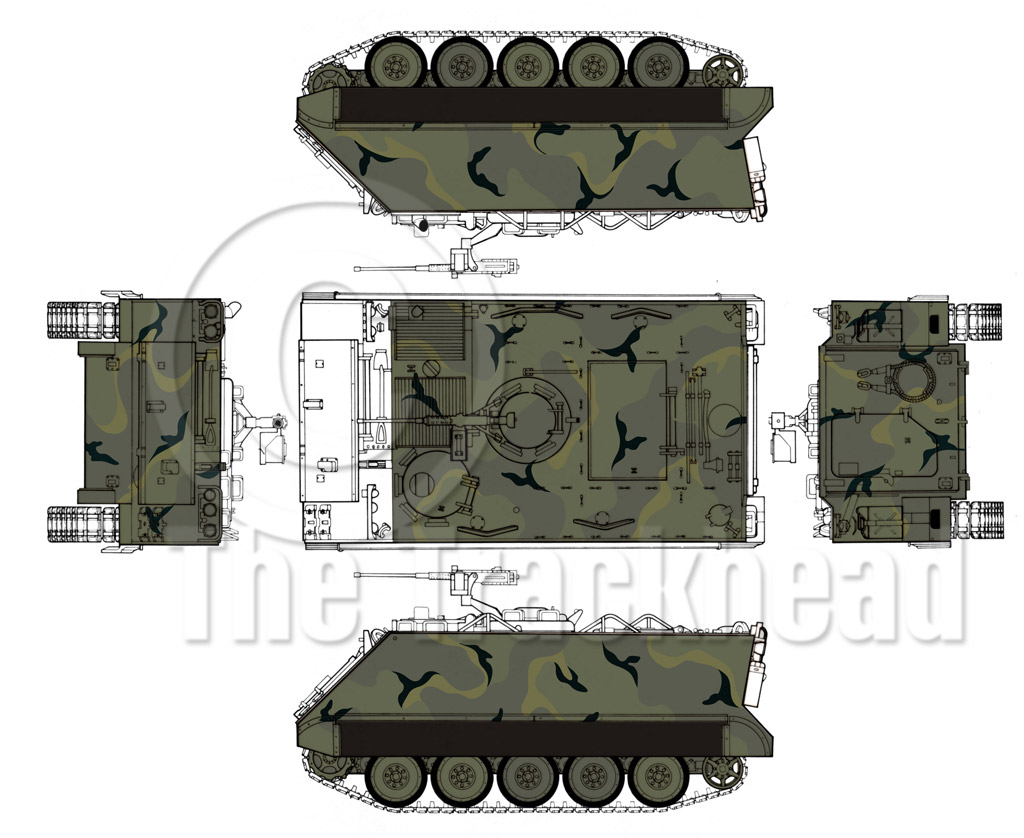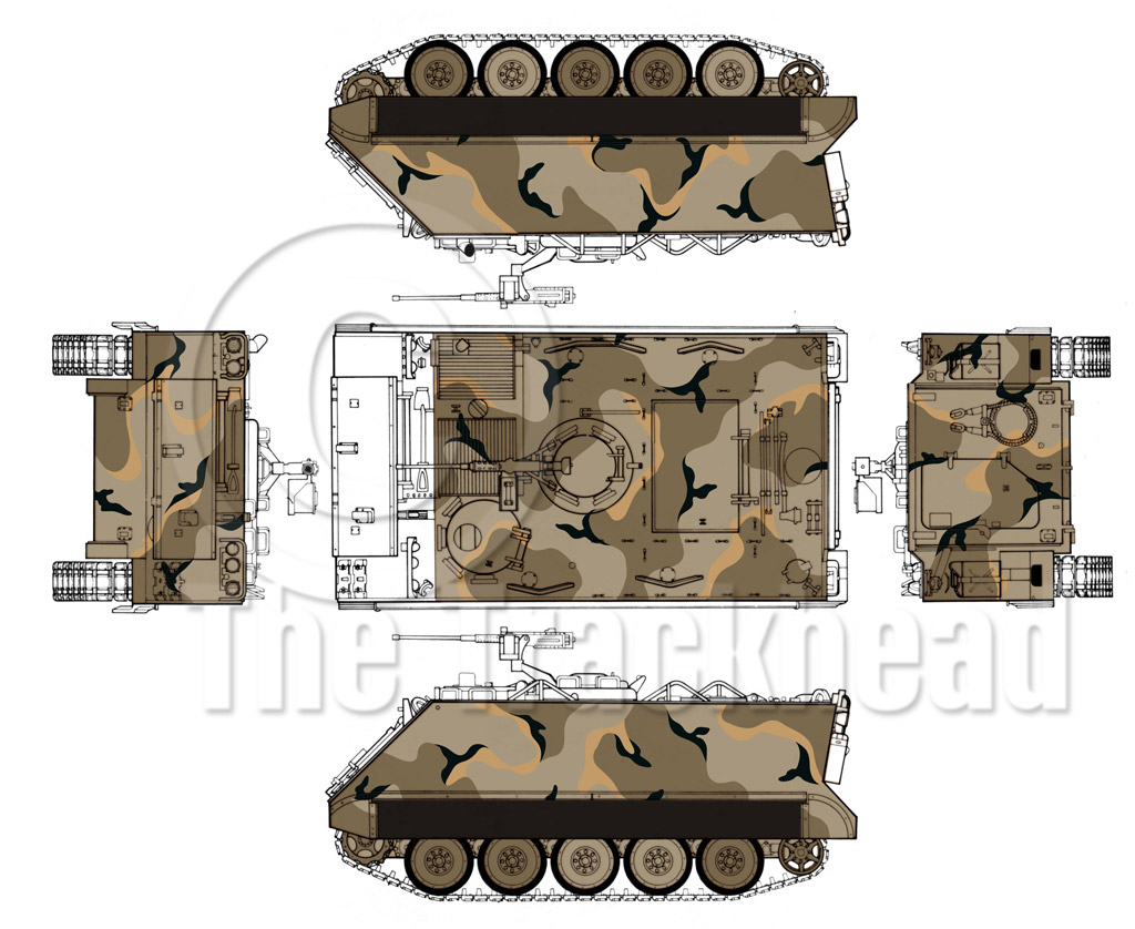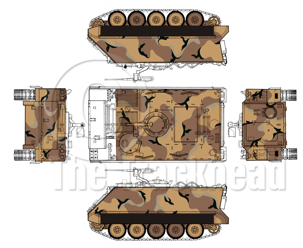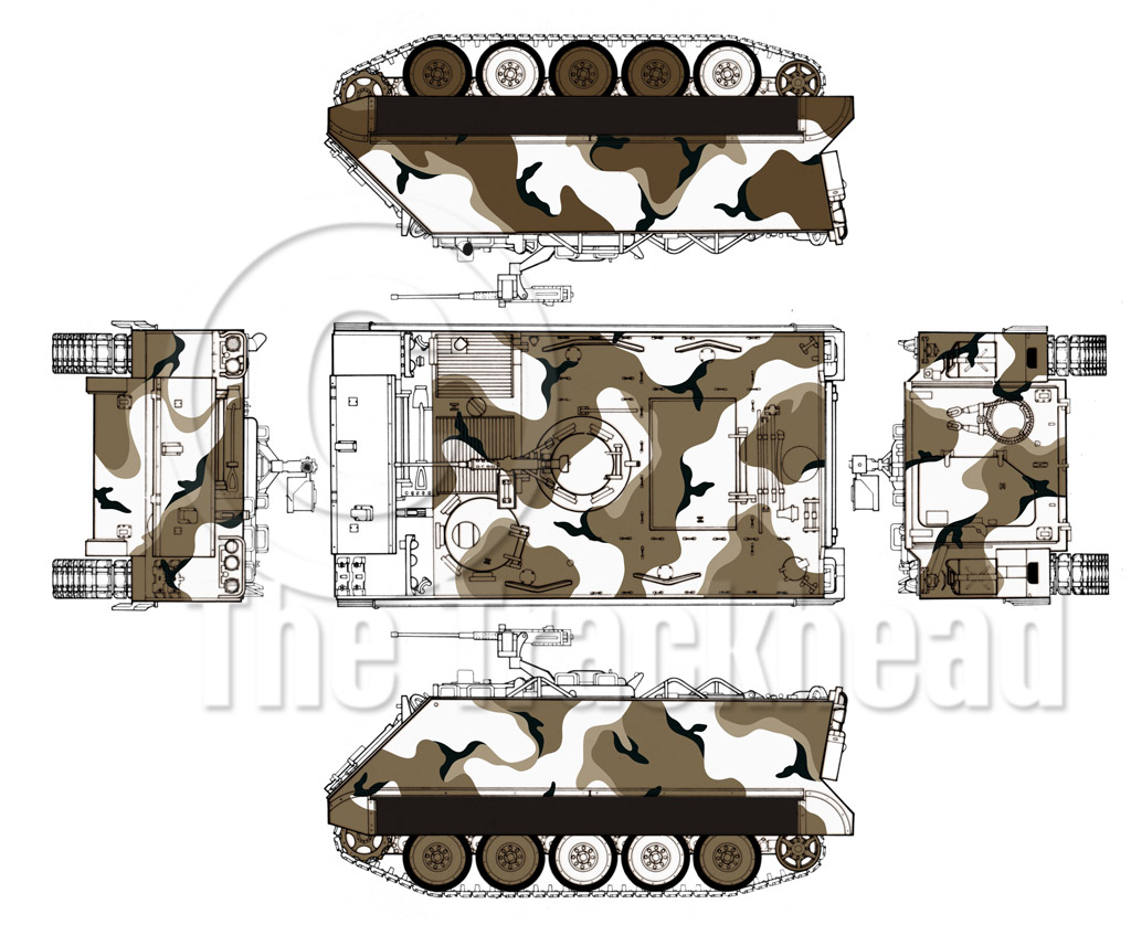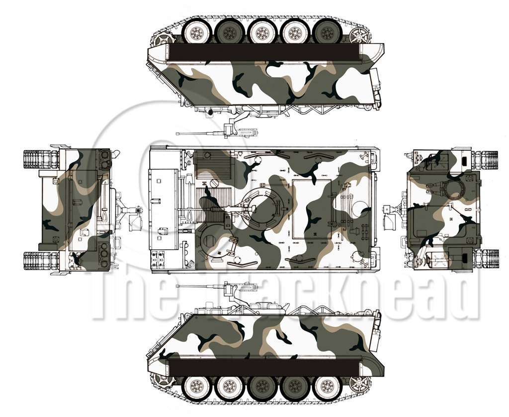 Για να φανούν οι διαφορές ανάμεσα στους 7 συνδυασμούς χρωμάτων (ο 8ος συνδυασμός δίνει ένα ...ολόλευκο όχημα) επέλεξα το σχέδιο της παραλλαγής που προορίζεται για την «οικογένεια» των M113 και συμπλήρωσα τα ανάλογα χρώματα για τον κάθε συνδυασμό. Για την μετατροπή των Federal Standard χρωμάτων σε RGB συμβουλεύτηκα τις ιστοσελίδες www.fed-std-595.com και www.simmerspaintshop.com ακολουθώντας τελικά τις «συνταγές» της δεύτερης, καθώς τα χρώματα που προέκυπταν από αυτές μου φαινόταν λιγότερο έντονα και πιό σωστά...